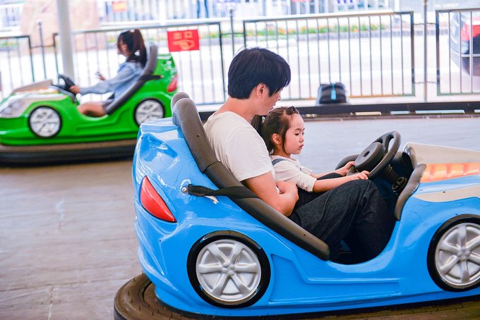 开碰碰车时一定要和爸爸一起,自己都知道要系好安全带。