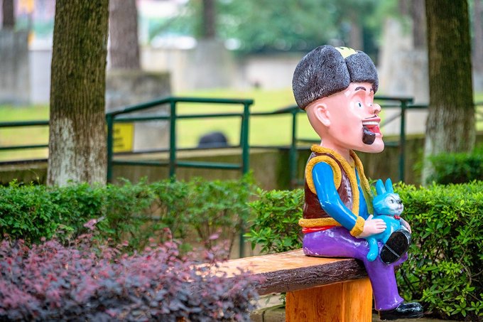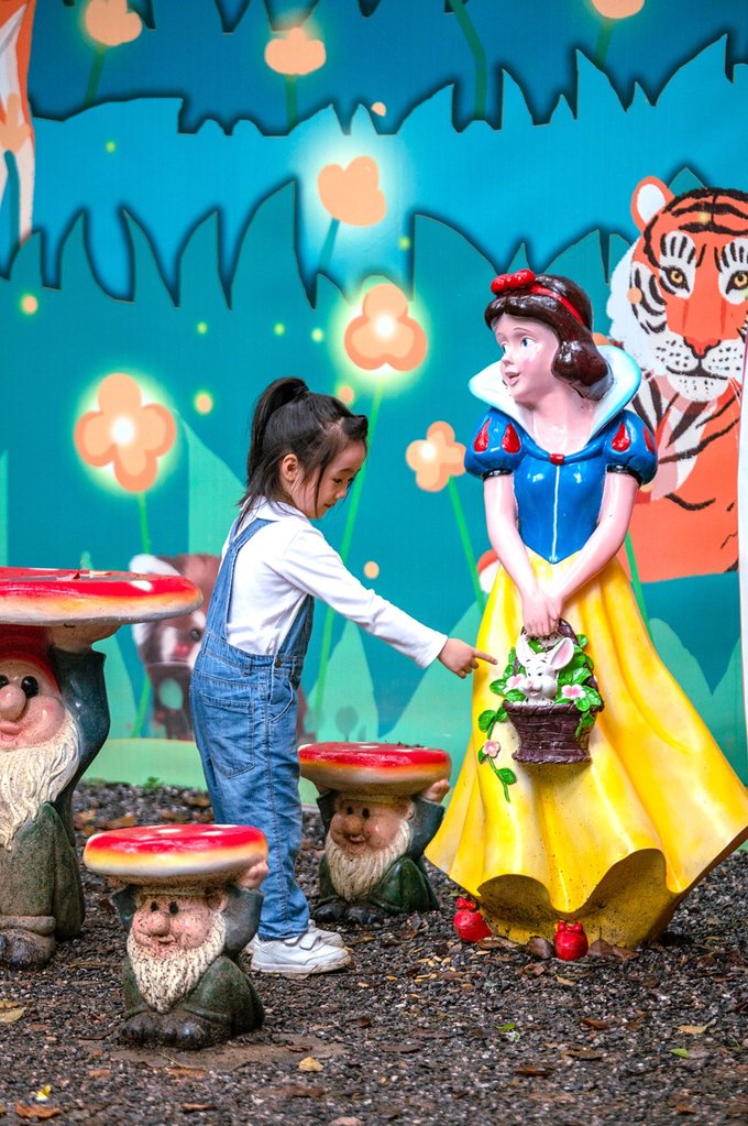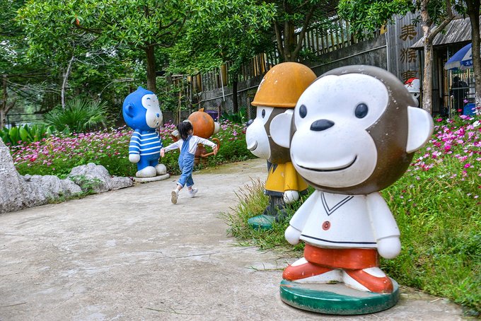 在园区走走逛逛,一路上很多好看的小朋友喜欢的雕塑和卡通坐椅,小姑娘恨不得每一个都要去看一下摸一下,每个都喜欢。
