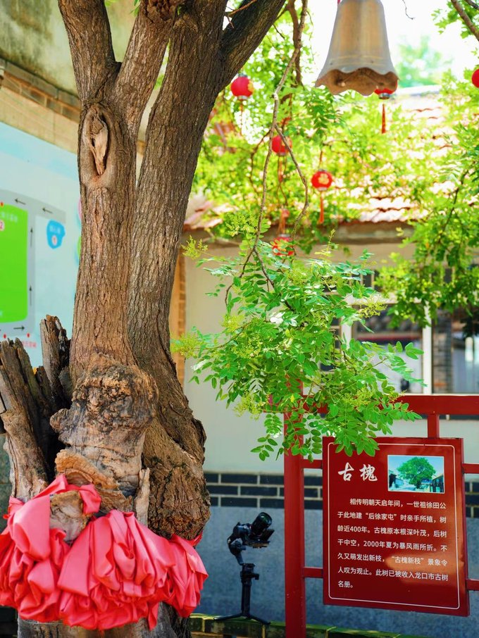 这是一座幽静的村落,整体建筑古老悠久,有清朝房70余栋10500平米、民国建筑30余栋4500平米,古建筑占村建筑面积的三分之二以上,辛亥革命巨子徐镜心故居也在此,始建于清嘉庆年间,距今已有200多年的历史。是省级文物保护单位。村内有颗400多年树龄的古槐树,是一棵建村树,少年时代的徐镜心常在这棵古槐下玩耍。2001年,一场龙卷风将树干折断,其后不久又萌发新芽,两个新枝形似一只佛手在托举着希望,此树被收入龙口市古树名册。“槐”通“怀”,我们取意“怀其乡”。