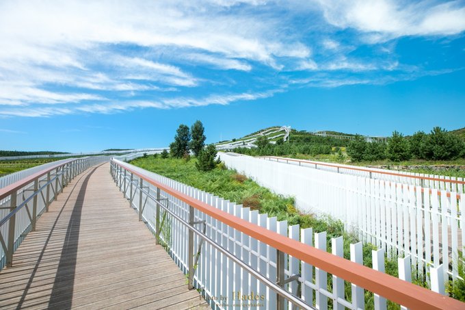 走出城区,我们来到天骄天俊生态旅游度假区。这是一座很年轻的景区,2019年7月才开业,是座国家3A级旅游景区。景区中,栈道两侧白色围栏构成的天骏廊桥,呈现出骏马的造型。从山脚缓步而行,景色清新。