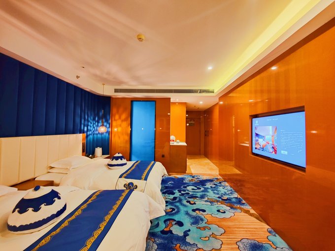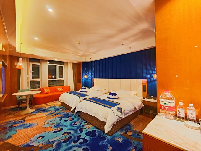 盛夏8月,西安的高温炙烤得人心烦意乱,百无聊赖翻阅地图,目光被700公里之外的鄂尔多斯锁定,这里有沙漠、草原、峡谷,还有好吃的羊肉,最惊喜的是气温只有20度左右! 还有什么是比酷暑之时寻觅一处静地避暑更让人快乐的呢,说走就走的旅行就此开始! 一、鄂尔多斯初印象,夜景这边独好 抵达鄂尔多斯已是晚上,从下高速的那一刻起,就已然爱上了这座城市——宽阔的马路、璀璨的城市照明,稀少的人流车流,满足了小妖向往人少景美的需求。 提前预定了四晚位于康巴什区的双满福源国际酒店,虽是现代化酒店,但是房间内饰蒙古风味浓郁,整体色调暖暖的,很宜居!