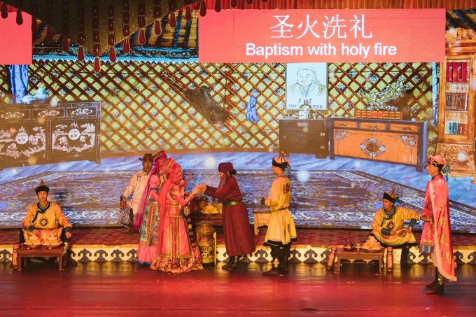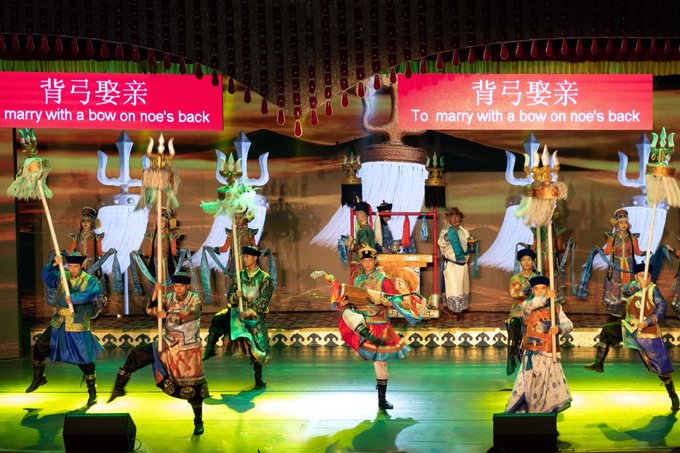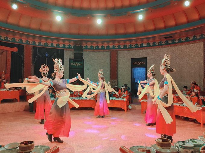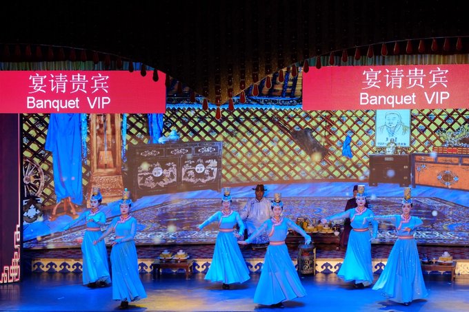 看完马术表演差不多到午餐时间了,景区餐厅12:50还有鄂尔多斯婚礼表演等待着游客们,边吃午餐边看婚礼演出着实让人惊喜,鄂尔多斯婚礼也是一天两场,分别在12:50和19:30,大家可根据自己的时间选择场次。 鄂尔多斯婚礼发源于古代蒙古,形成于蒙元时期,鄂尔多斯地区至今仍完整地保留着婚礼的仪式程序,并使其发展演变成为一种礼仪化、规范化、风俗化和歌舞化的民俗文化。鄂尔多斯婚礼有哈达订亲、佩弓娶亲、拦门迎婿、献羊祝酒、求名问庚、卸羊脖子、分发出嫁、母亲祝福、抢帽子、圣火洗礼、跪拜公婆、掀开面纱、新娘敬茶、大小回门等一系列特定的仪式程序