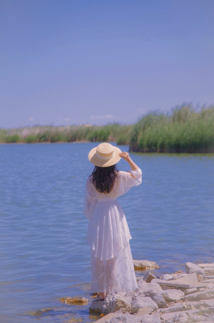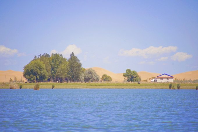 近拍七星湖,湖水还是蛮蓝的,与蓝天白云相映衬,完全看不出是在沙漠地带。