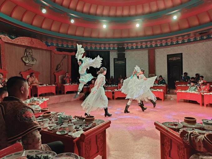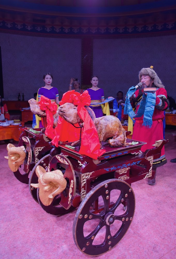 待到夕阳降临,拍完最后一张草原人像,我们不舍的赶回餐厅,准备参加特色晚宴——炸马宴! 炸马宴是蒙古族特有的庆典宴飨整牛席或整羊席,是一种沉浸式体验的宴会,因为游客是要换上华丽的蒙古族服饰品尝蒙古族美食的奥,炸马宴体现了蒙古王公重武备、重衣饰、重宴飨的习俗,菜品主要是羊,用酒很多。