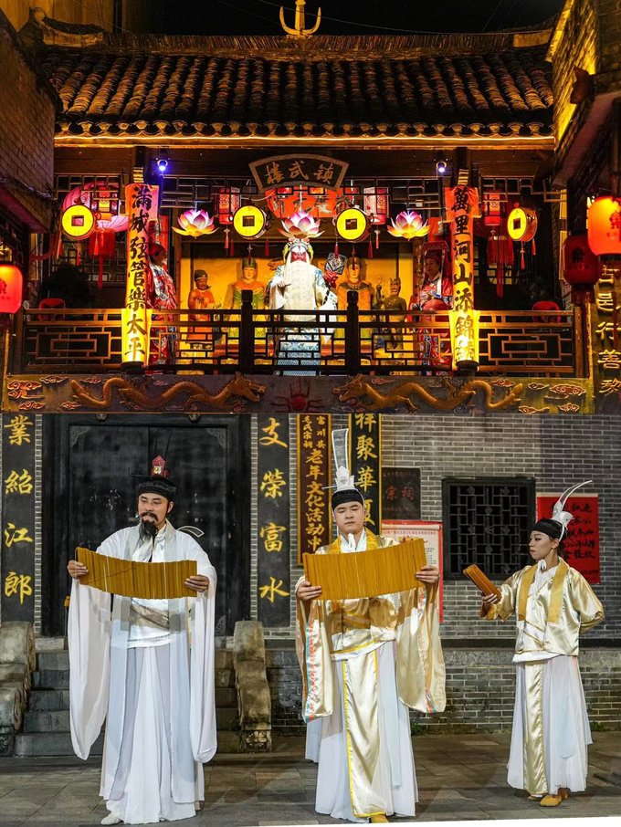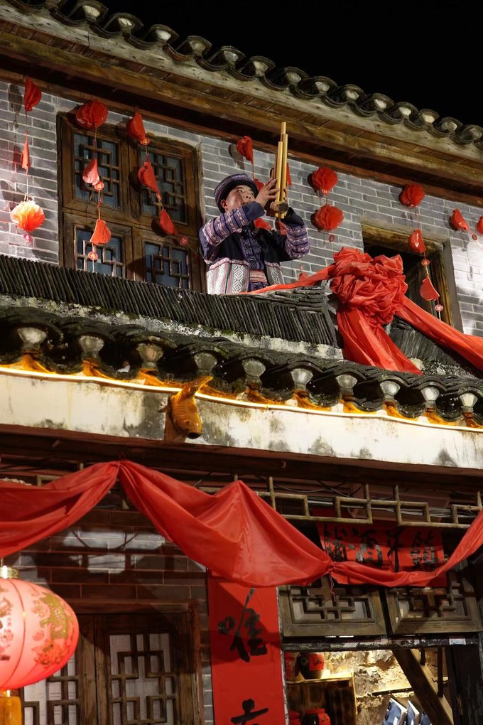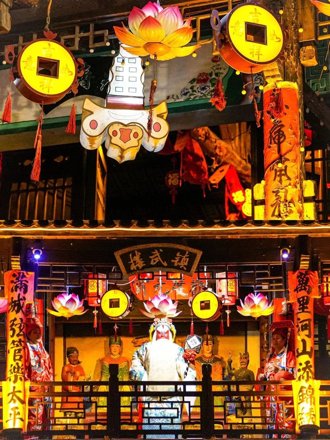 城内街巷交错,店铺林立,华灯初上,古戏台下观客成群,民族舞和戏台都有不同时间段的演出,热闹非凡。