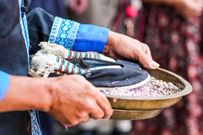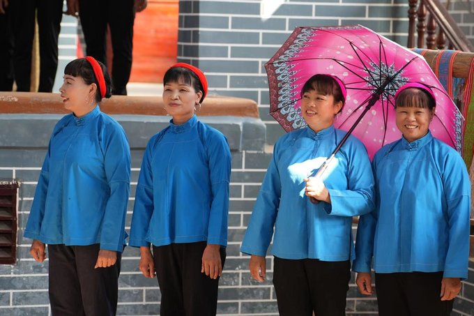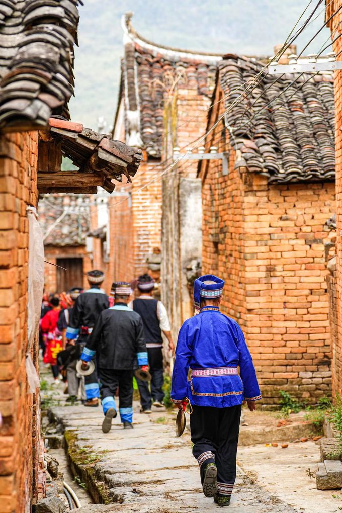 倾吐完自己对亲人们的依恋难舍之情后,新娘还会祝愿家人在她出嫁以后能万事如意、幸福快乐。行娘哭嫁哭到门头,鞭炮响,花轿迎,新郎迎亲迎到村口,路过的每一个门楼前,都有礼数尊拜以及全村人的祝福。