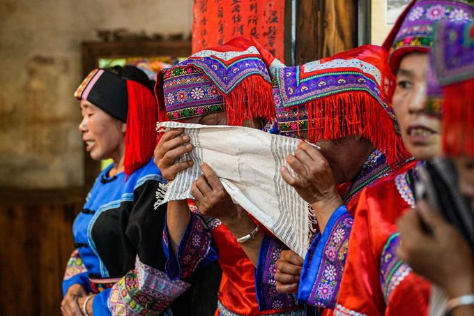 瑶族姑娘出嫁前一天晚上,所有亲戚都来送行,整晚不睡“坐歌堂”,家里的人围坐在一起对歌,教育自家姑娘今后的生活道理。