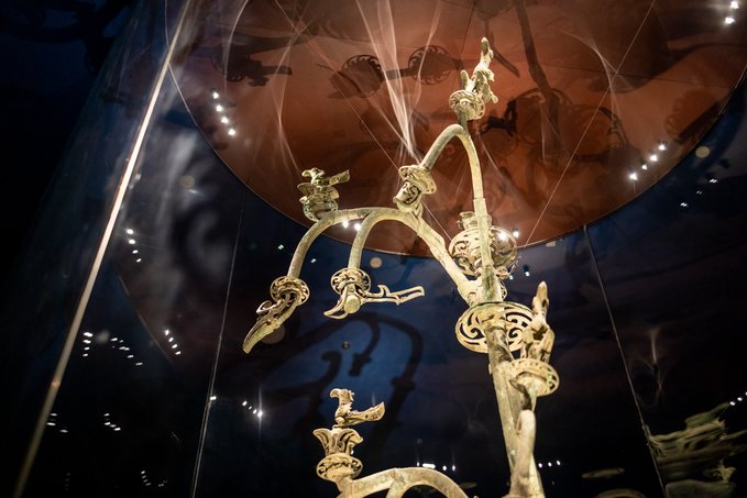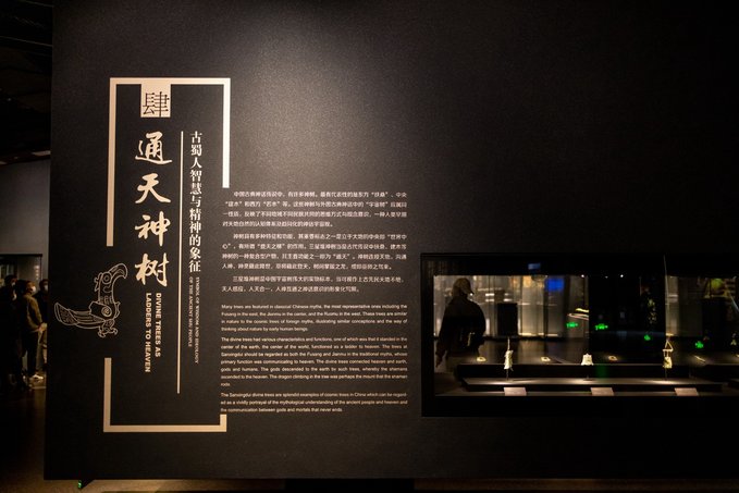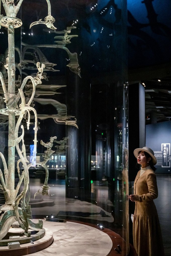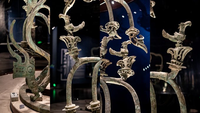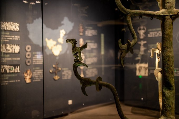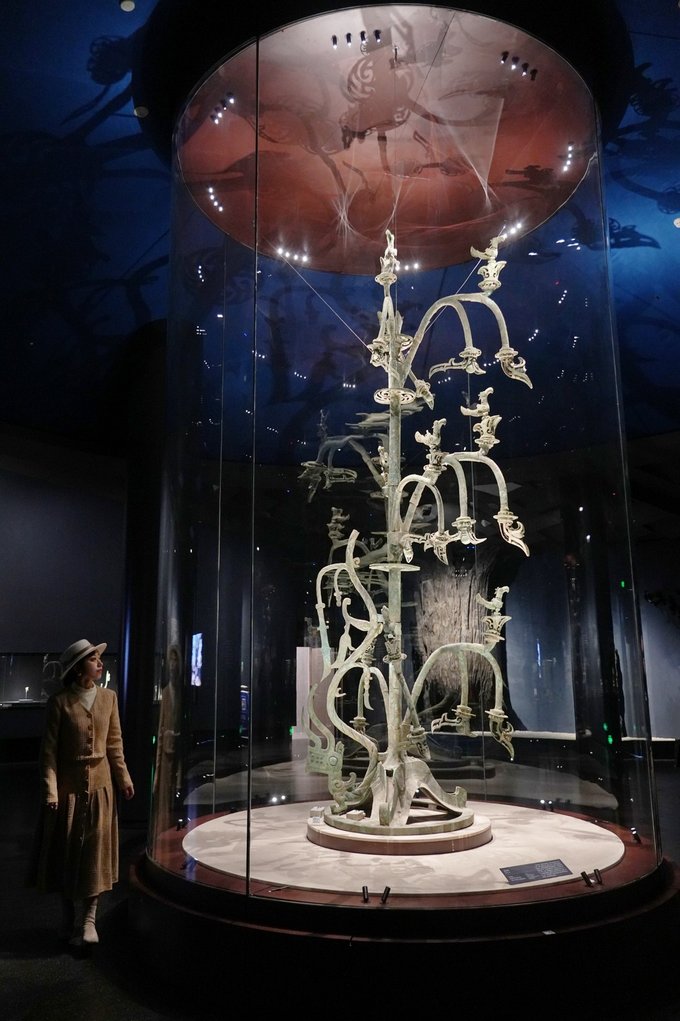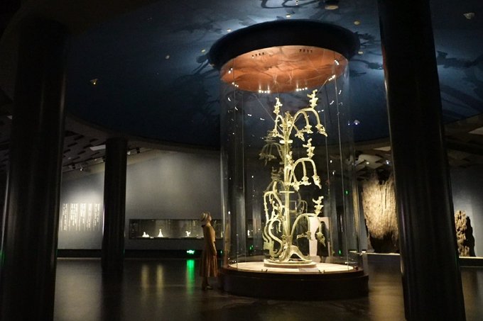 大型青铜通天神树 三星堆博物馆的综合馆展厅中央,陈列着博物馆的“镇馆之宝”之一——青铜神树,这是世界上体量最大的古代青铜器之一,树上有大量复杂、神秘的装饰元素。