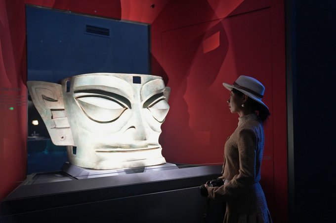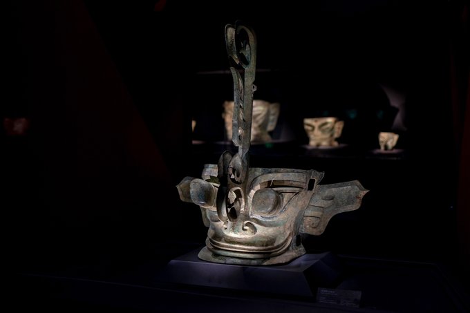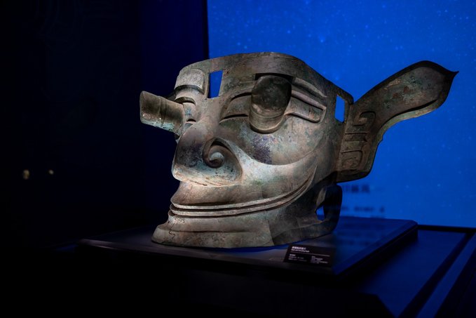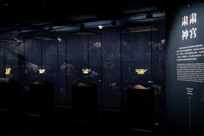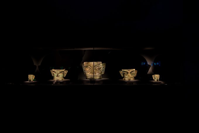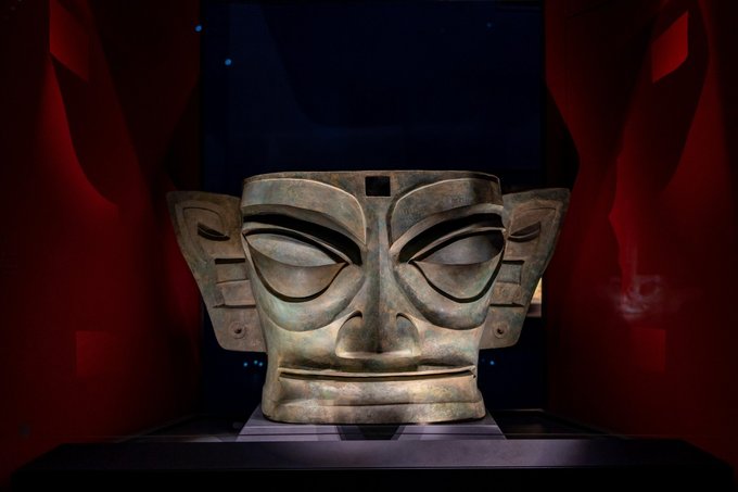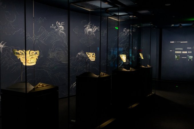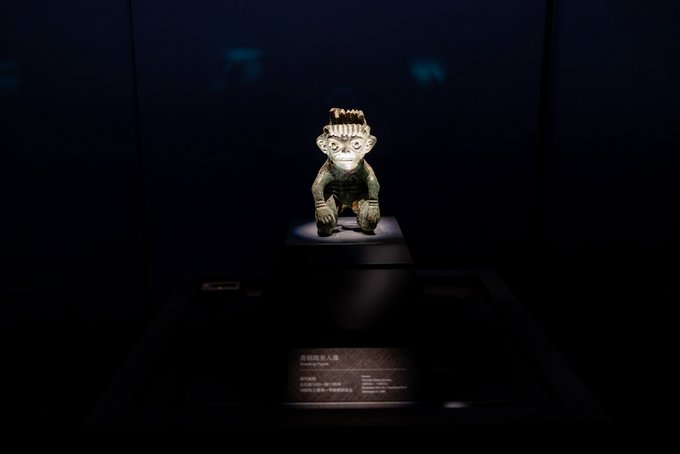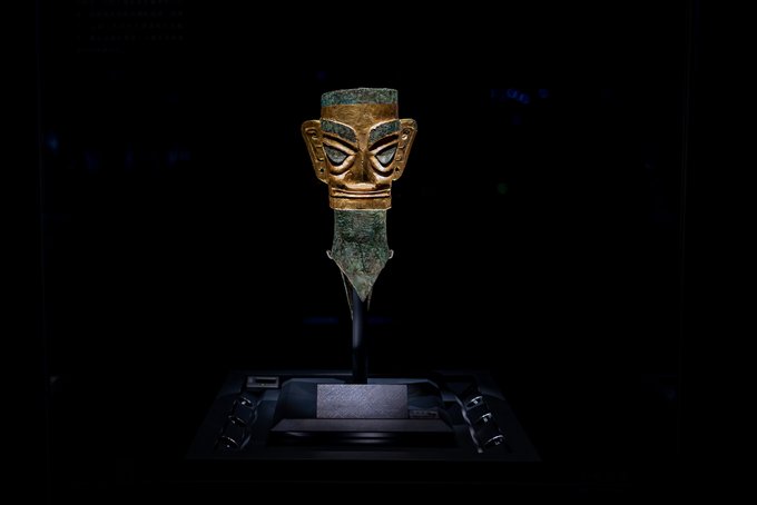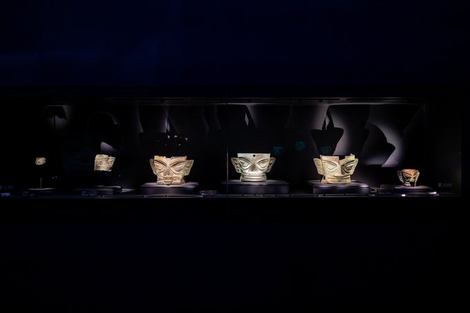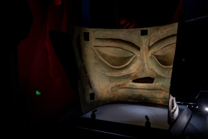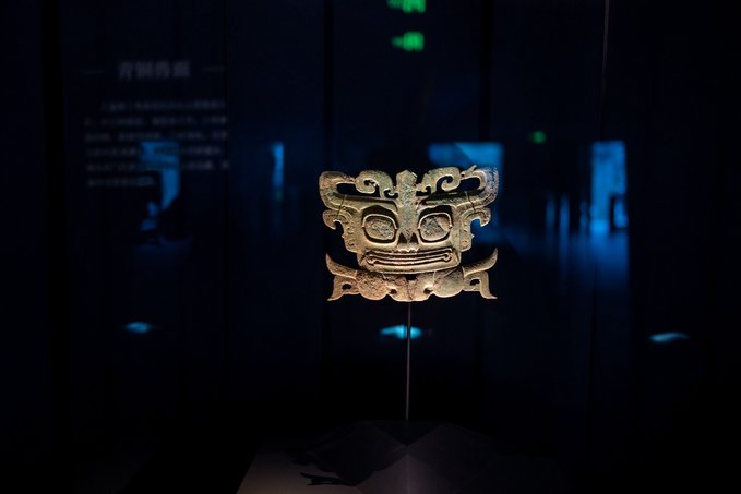 二展馆是青铜器馆 三星堆独特的青铜纵目面具、青铜人头像等陈列在此。这些都是1986年出土的。