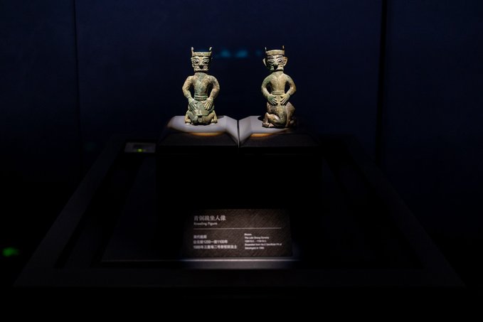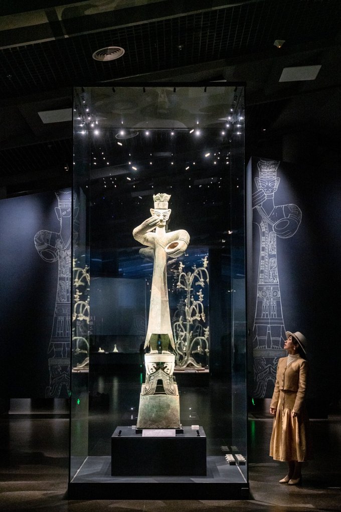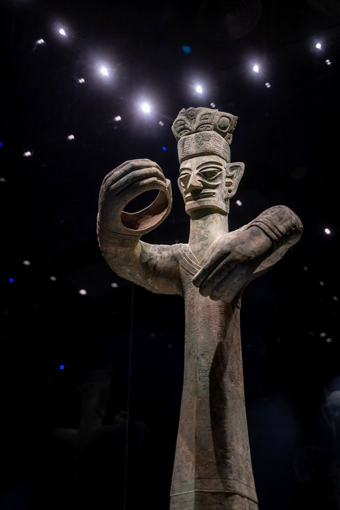 必打卡镇馆之宝 青铜大立人像 一个身高1.8米的青铜人像,站立在高达0.8米的台座上。这是三星堆古国最有代表性的器物之一,也是举世罕见的古文明大型青铜人像。