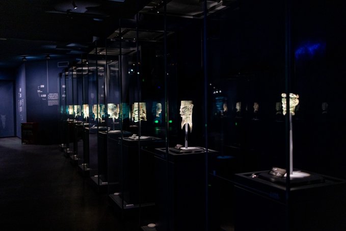 博物馆展馆参观 总共两个展馆 一展馆为综合馆 包括了陶器、玉器、青铜器、金器等,三星堆最有名的金面具、金权杖、通天神树、大玉璋、大立人皆陈列在此。