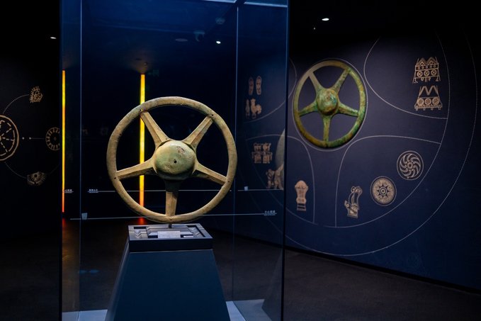 铜太阳形器 形似“方向盘”的太阳轮,用了五道光芒和一个晕圈表现太阳的光明,这种形制的器物从未见于以往的出土文物。