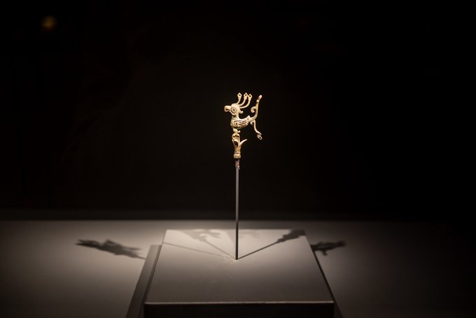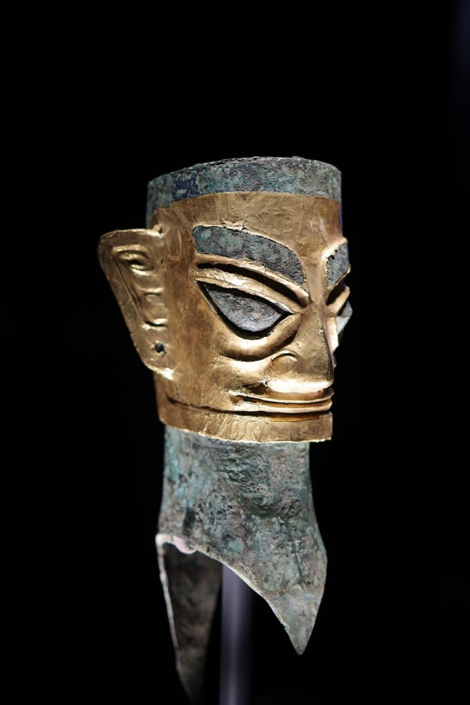 金面铜人头像 古蜀以金为尊,在57件青铜人头像中,戴金面罩者仅有4件,可见其身份也最高贵,据学者研究,笄发或许也是身份的象征。