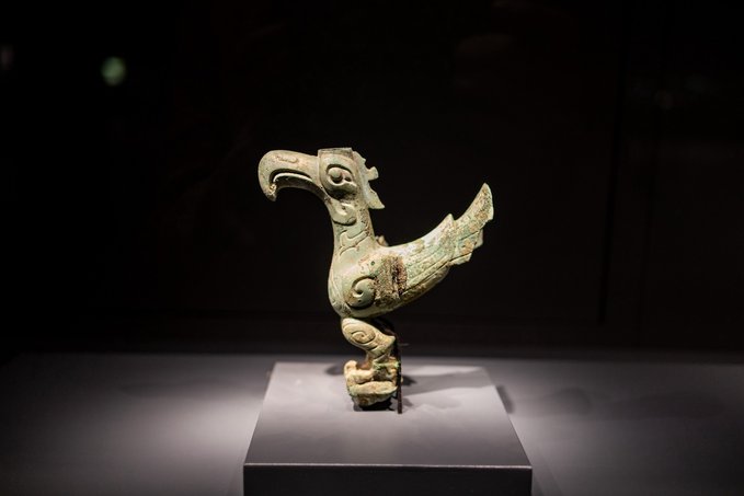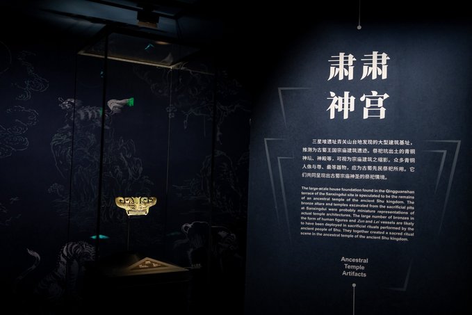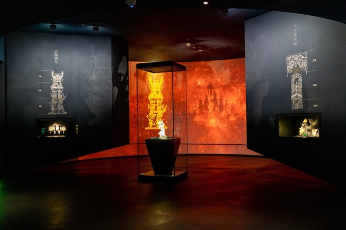 青铜神坛 二号祭祀坑出土之青铜神坛,经研究性复原,其构造从上到下分别是,神殿与山峰、巫师、一对神鸟,寓意天、地、人三界,展现了古蜀人的神话宇宙观。