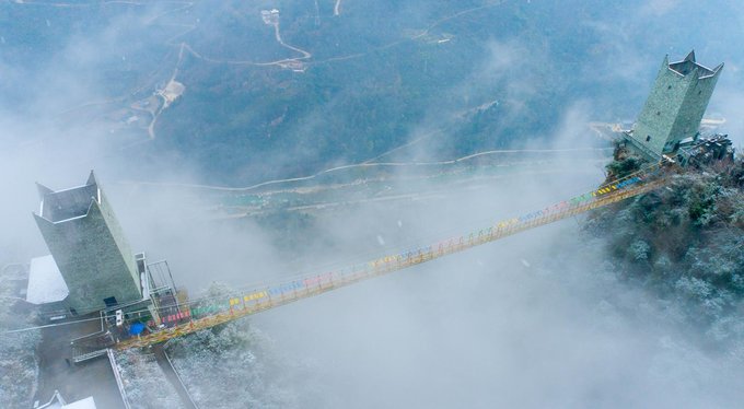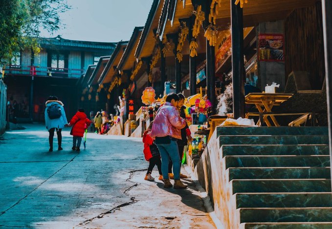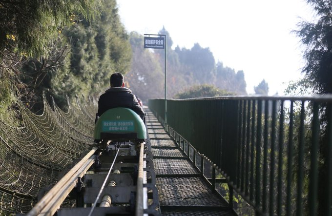 冬季的话雪景基本就在景区的后山了,第一段缆车下来之后还在景区的前山,需要继续向山上走才能到达后山,可以选择步行走景区游步道或者中途有一个高空滑道可以代步,经过一段小吃街,可以品尝特色小吃补充体力或是小憩,之后转乘去往后山的缆车到达山顶之上。