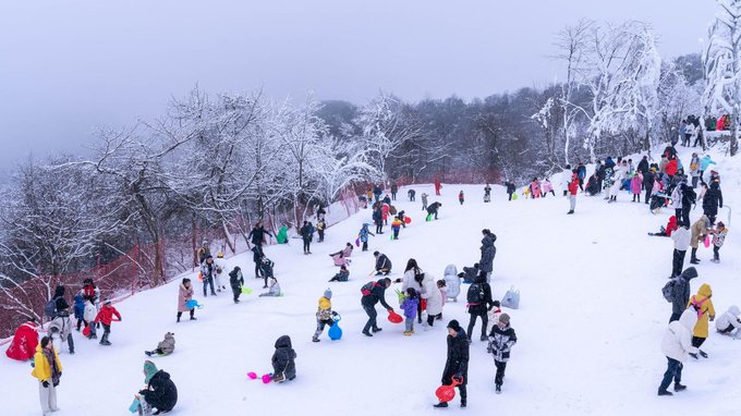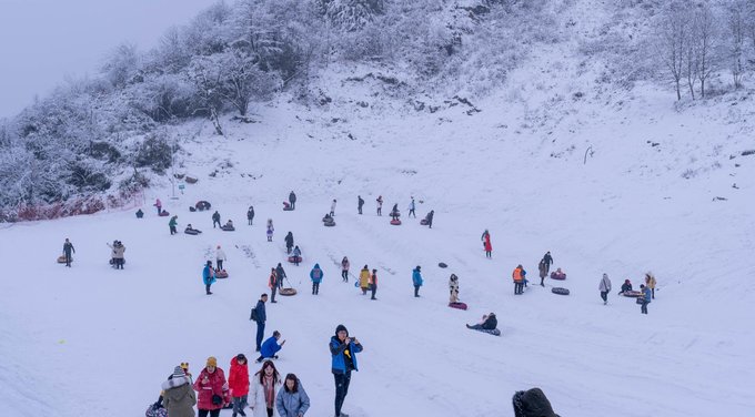 缆车到达山顶之后,便已经是白雪皑皑,山尖的雪白才会让人顿感惊喜,那种和城里难得见到雪花的状态形成的反差反而让人更觉得欣喜,乘坐滑雪场观光车便能直达滑雪场,沿途也能看见漫山雪白,眼睛已经被美景所包裹,滑雪场地入场会有小猕猴可以逗趣。还有专门的玩雪点,有小型器具很适合带孩子游玩,里面是餐厅和滑雪道,初、中级滑雪场,可以根据自己的情况进行选择,还有雪圈游玩。