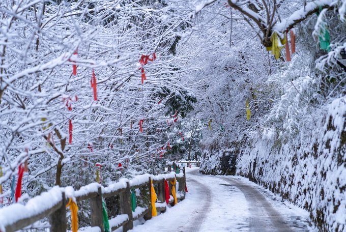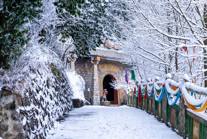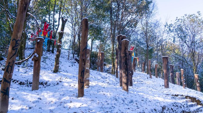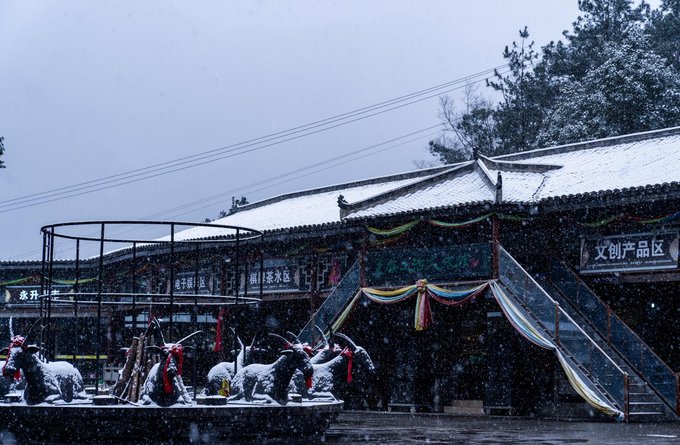 从滑雪场返回到乘坐索道的地方,沿着尔玛古道的方向过去,一路雪白可以一路拍照,中途会经过神树林、天神殿、羌碉,可以领略羌族的信仰和羌族的建筑,感受不同于常见的建筑物和少数民族的信仰的力量。