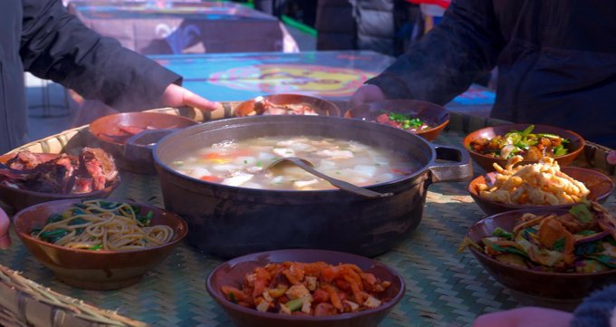 中午可以在滑雪场用餐,有特色的雪地火锅可以体验,也可以去往云中农场体验特色餐食簸箕宴,如果早上在云中农场游玩午餐就可以选择簸箕宴。