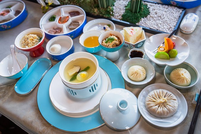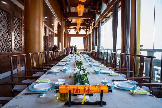 乘电梯至七楼,走入餐厅的那一刻,被眼前的场景所震撼,豪华的中式餐厅,一边是整面的落地玻璃,一线江景尽收眼底。中餐厅中间是一张长长的大桌子,两边整整齐齐地摆着两排太师椅,桌上还放着一道“圣旨”(里面是菜谱)。这场面,清朝时王公大臣吃早餐估计都没这阵势。