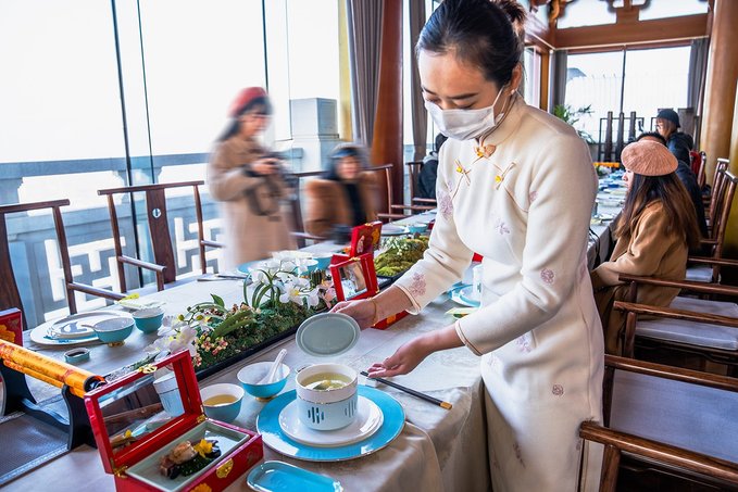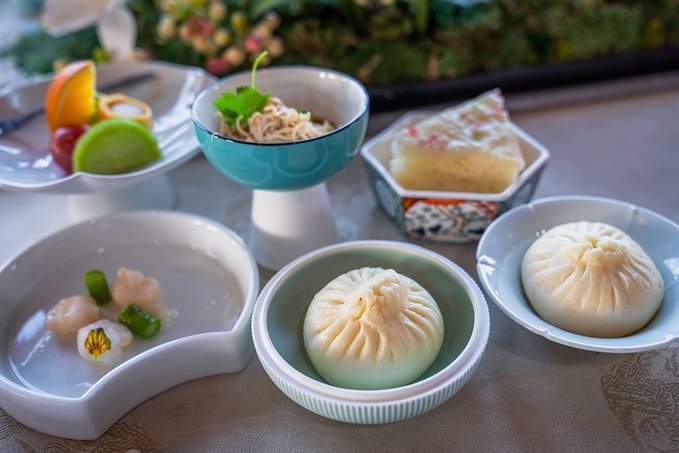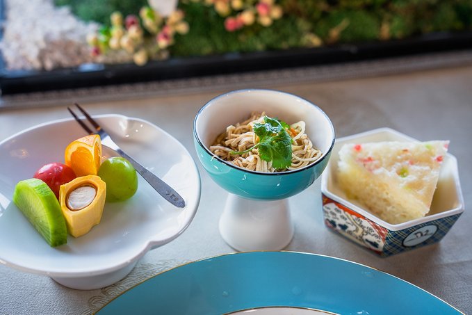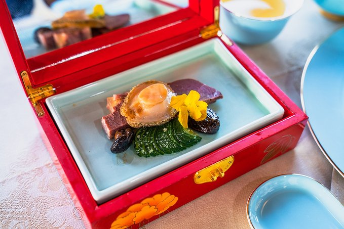 上菜了,穿着中式服饰的小姐姐为每位客人送上精美的早点。这第一道是前菜,用的是一个精美的红锦盒作为容器,非常的雍容华贵。特别是盒子盖上还有面镜子,可以时刻关注自己的形象,创意感十足。菜品由水晶肴肉、糟醉鲍鱼、教场牛肉、蓑衣黄瓜、香菇等组成,摆盘精致,味道纯正。