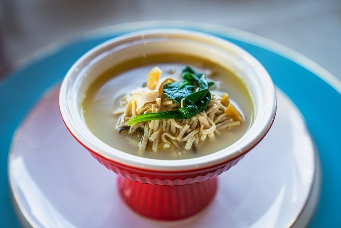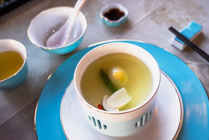 热菜,松茸竹荪藕韵。这道汤里面有松节、鸽子蛋、竹荪、芦笋等食材。此汤看似寡淡,味道非常鲜美爽口,清晨来上这么一口汤,感觉整个人都神清气爽。个人非常喜欢这道汤,连汤带菜吃个精光。