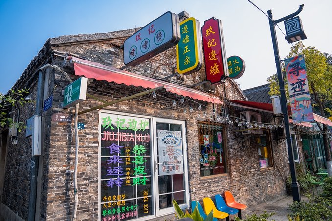 越往里走,这韵味就更足了。古朴的老房子,装饰了现代门面,各种艳丽的色彩,为原来朴素的老房子增添了许多的活力,且完全没有违和感,给人一种耳目一新的感觉,这要是到了晚上霓虹闪烁效果会更好。