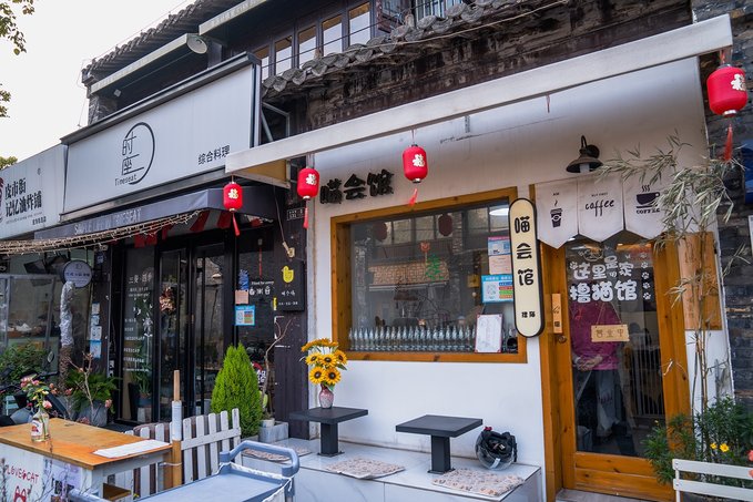 街道两侧的店铺布置得有些随性,装修风格更是五花八门,几乎涵盖了全世界我们所能知道的风格。但关键的一点,你粗看这些店家的装饰很随性,却有着自己独特的个性,创意感十足,这也最受时尚新潮的年轻人喜爱,这或许就是皮市街能成为网红街的重要原因之一。