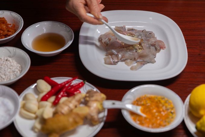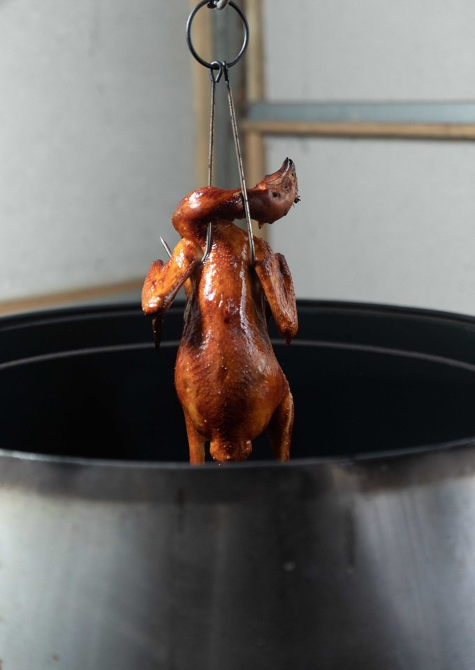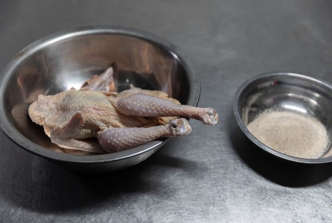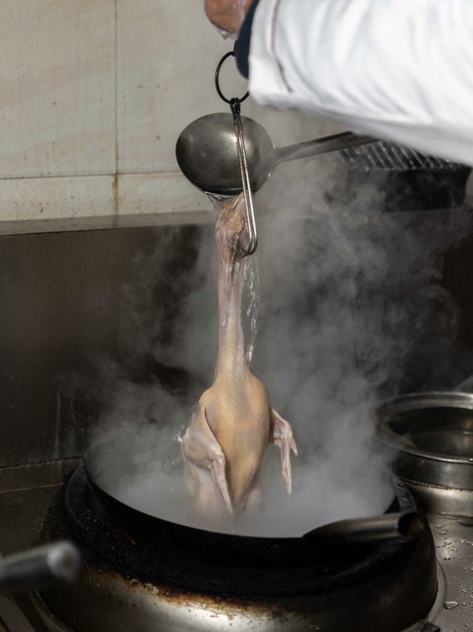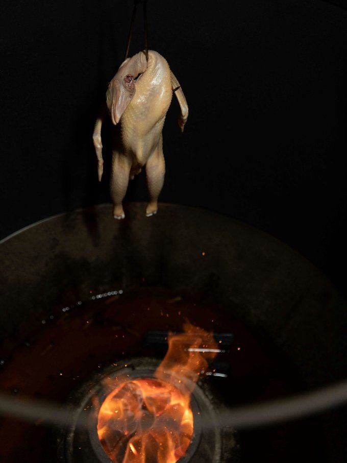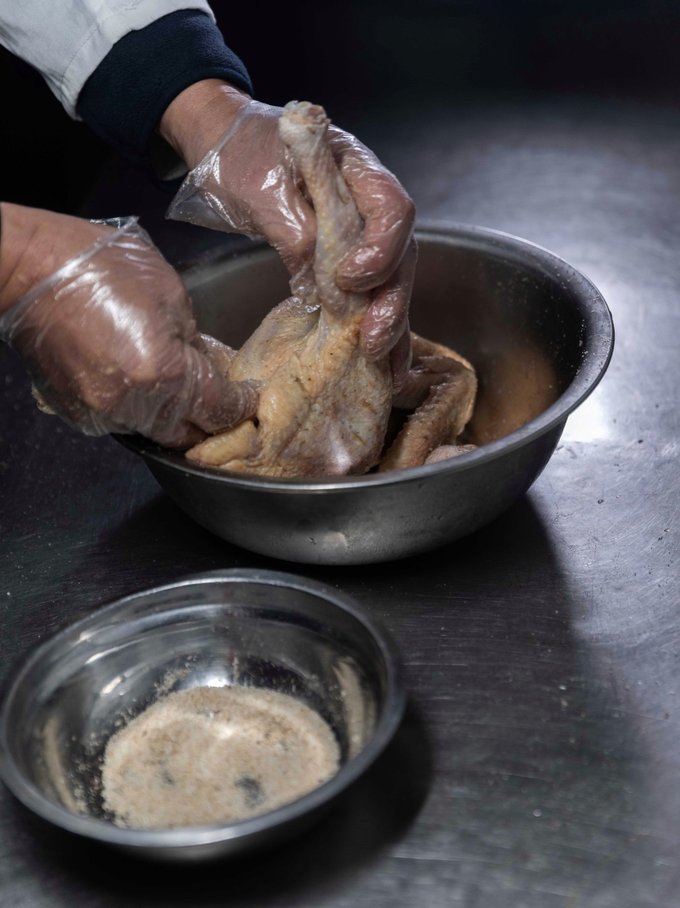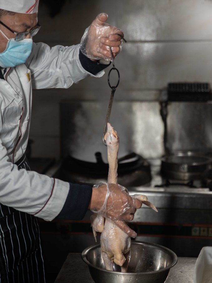 博阳河景区的大厨先用秘制的香料给鸡全身涂抹,再去锅里淋 上高 汤,通风晾晒,每一步都不能少,而且腌制和晾晒时间也相当重要,是决定鸡口感的关键。