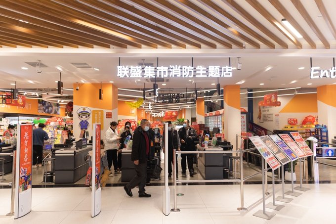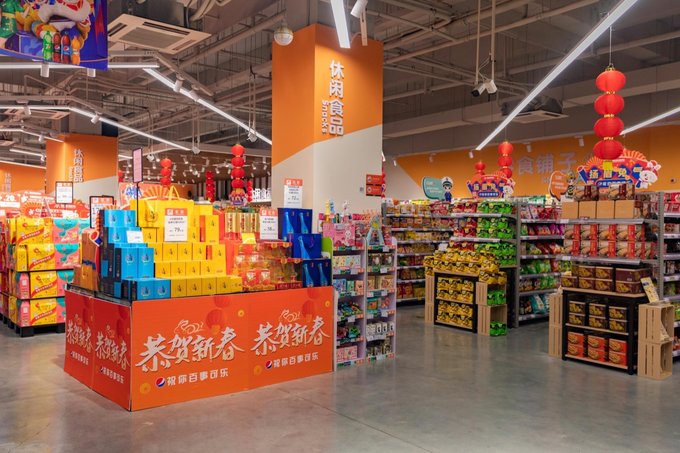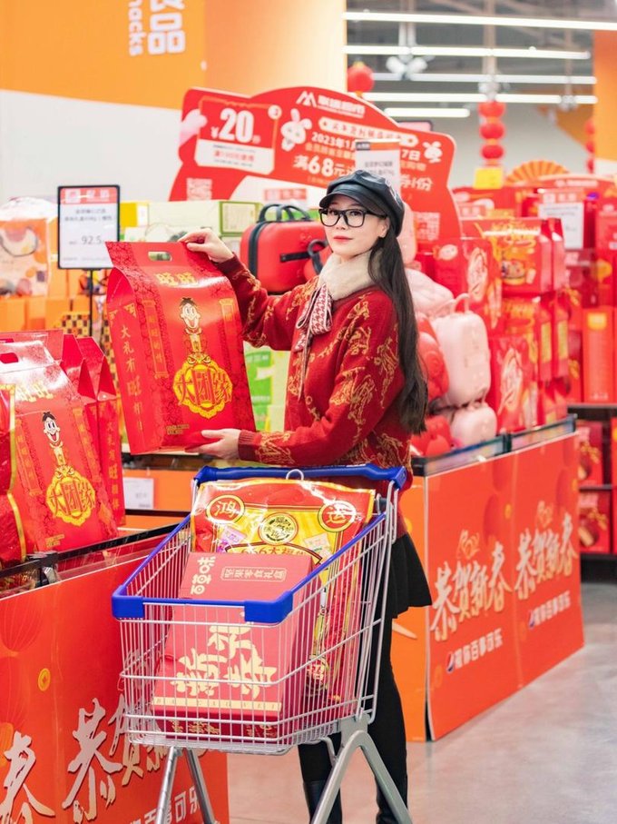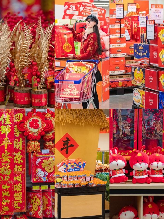 超市两旁挂满了灯笼,喜气洋洋的!广播里,锣鼓阵阵,乐曲激昂。品种繁多的年货堆积如山,人们穿梭其间,精心为家人挑选着喜爱的物品。