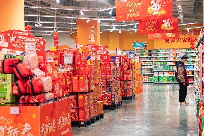 超市里真的是热闹非凡,买,买,买的节奏在这几天似乎到了疯狂的程度。各种的拜年礼包,孩子们喜欢的食品琳琅满目。