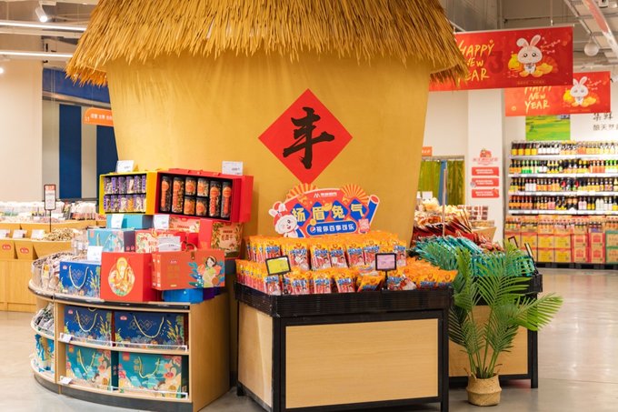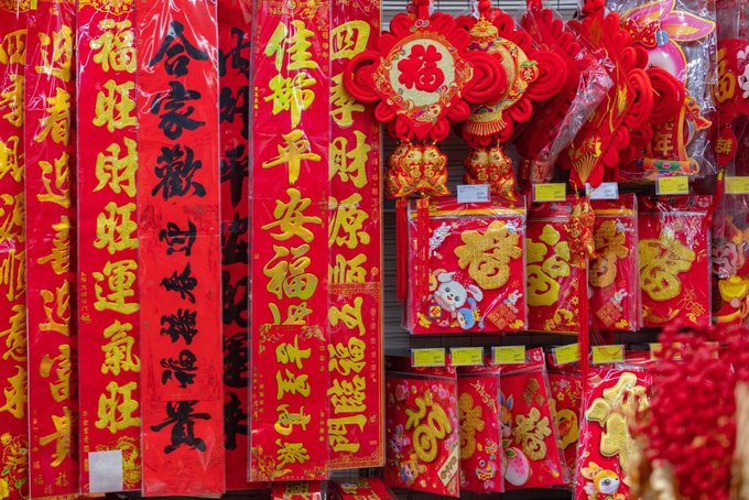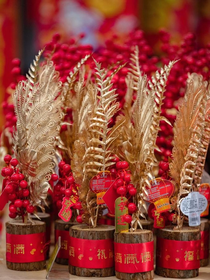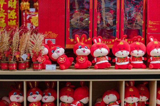各种兔年的玩偶,手写的春联,福字也挂满了橱窗。写春联,迎佳节,祝福新春,人们都大包小包,将美好的祝福带回了家。