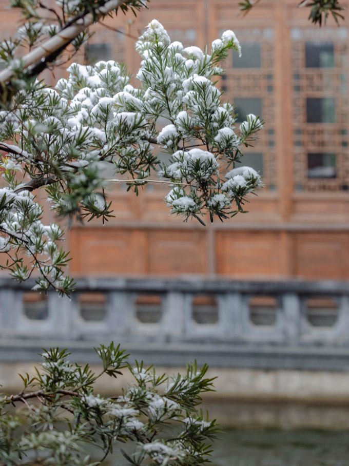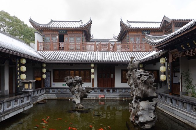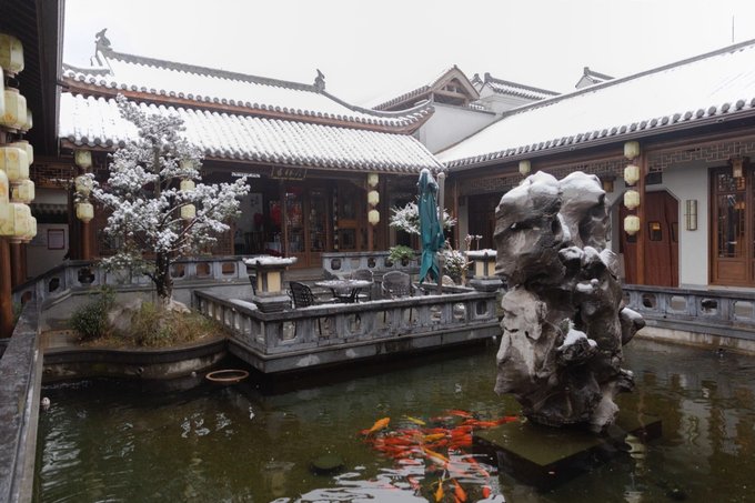 九江 市唐宋时期称为江洲,走进位于八里湖畔的江洲大院,就好似走进了七百年前的 九江 大户人家。一层有假山池塘,养着鱼,正巧又下雪了,给院子更添了一份灵动的美感。