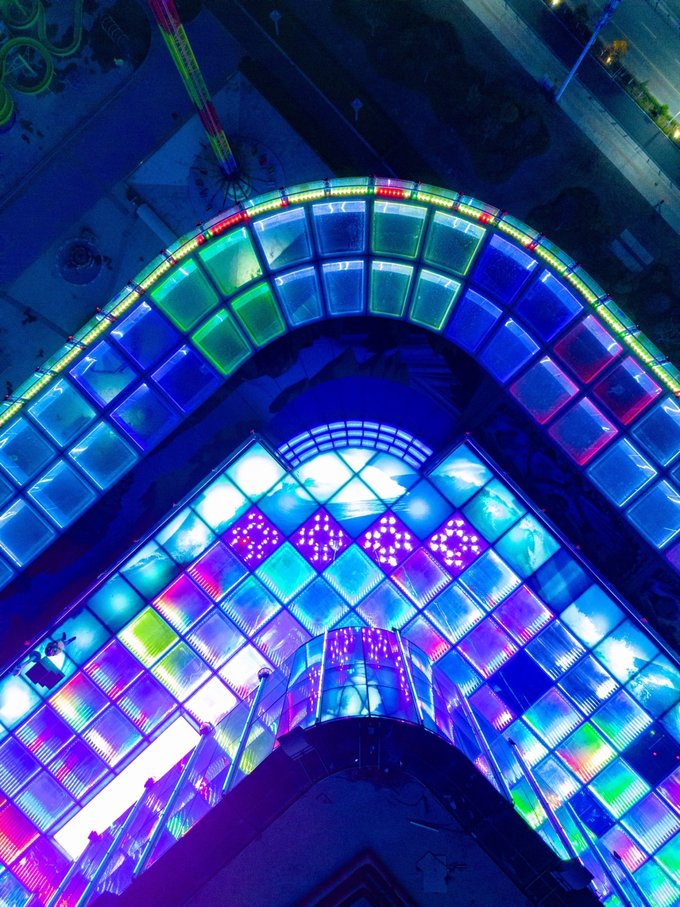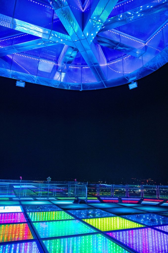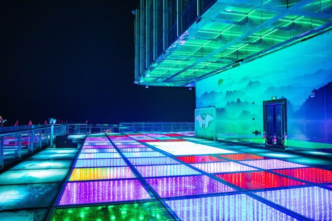站在距离地面百米高的玻璃观景平台上,不仅可以眺望远处的城市美景,还可以亲身体验动感特效“玻璃破碎”的惊险一幕。