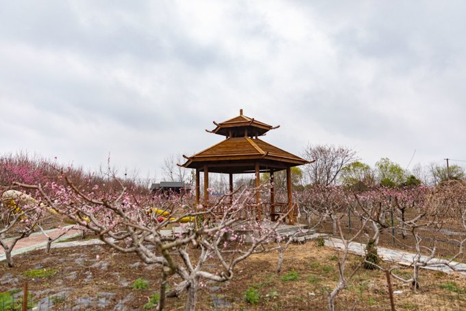 三月,这里的桃花开的正好。 桃园三结义是在《三国演义》里记载的故事。昔日,刘备、关羽、张飞志同道合,共创大业,他们选择了桃花盛开的季节和桃花盛开的花园。