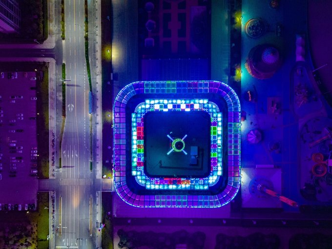 玻璃观景平台在晚上会有五彩的灯光,超级美。这里定时还会举办音乐演出活动,可以伴着悠扬的小提琴声欣赏着新汴河景观带的霓虹,好不惬意。