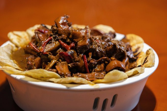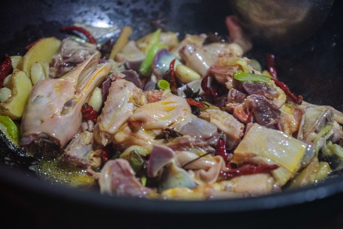这家不仅有各种特色小吃还有传统农家菜肴像土灶烧大鹅就是他们的招牌菜。这个鹅需要刚好的火候,慢慢地炖,吃起来味道鲜美,口感独特。
