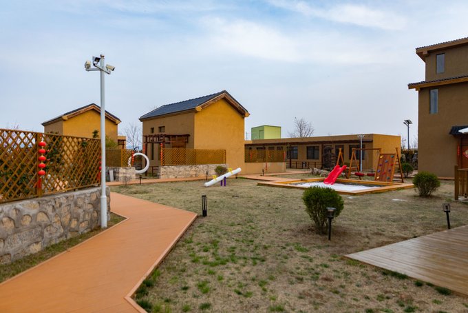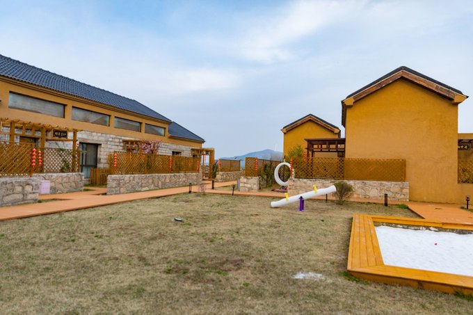 公共区域有休息厅,也有给孩子们玩乐的地方,庭院里种满了绿植和花草,春天民宿后面还有大片的油菜花田,诗意的生活大概就是这样子吧!