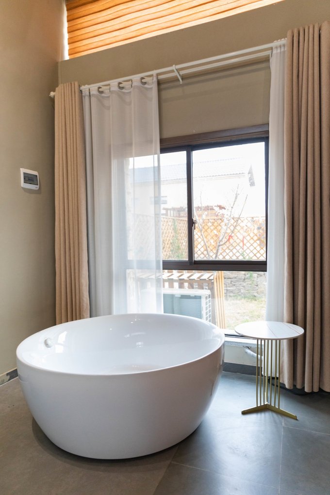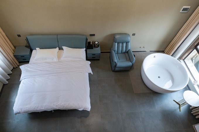 复式民宿内部是楼上楼下的布局,配备了两张大床,还有圆形的浪漫大浴缸,设施齐全,空间宽敞,温馨惬意。在这里远离城市的喧嚣,去拥抱春天,真是太美好了!
