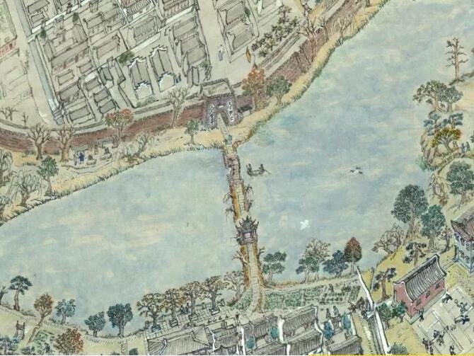 而今,在慈城的冯俞宅里,仍能看到按郑雷孙原图尺寸仿制的《旧时故乡图》。 在这幅画里,田野山林之内、城郭四合的慈城古镇跃然纸上。数百幢房子、十余条街道、河流、桥梁乃至老树无不清晰可辨,如果用放大镜看,街上的行人宛然如真。 我借由这位老人的乡愁,对慈城产生了浓浓的兴趣。