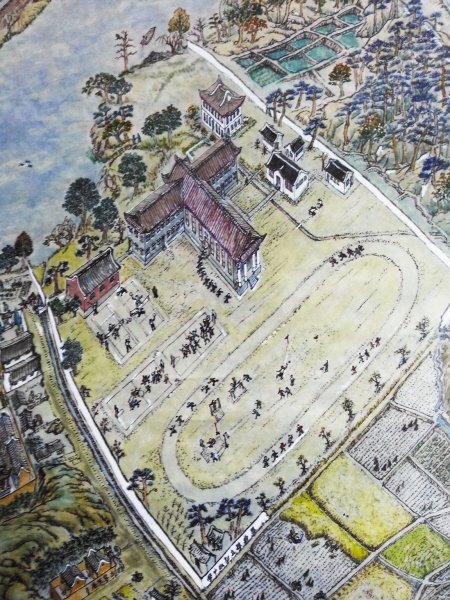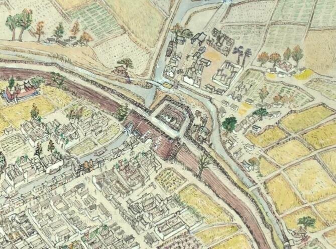 这是1938年,慈城的模样。 来慈城前,就被这幅《旧时故乡图》所吸引,她被誉为慈城版的《清明上河图》,是一位耄耋之年的海外华侨历经8年绘制而成的,儿时的故乡。 他走遍名山大川,最终还是觉得生他养他的慈城最好:“慈城巴掌大的地方,却山川湖泊、平原沃野、铁道公路、寺庙道观、拱桥牌坊以及数不清的旧宅大院应有尽有,历史又那么悠久,放眼整个中国也难得一见。” ▼《旧时故乡图》(部分)郑雷孙