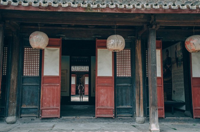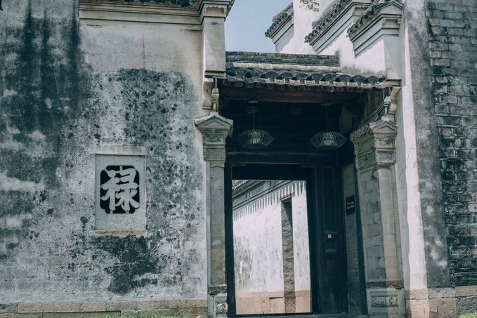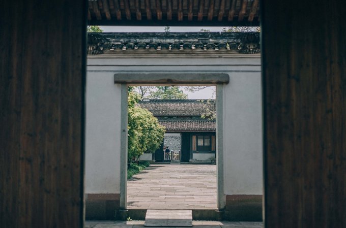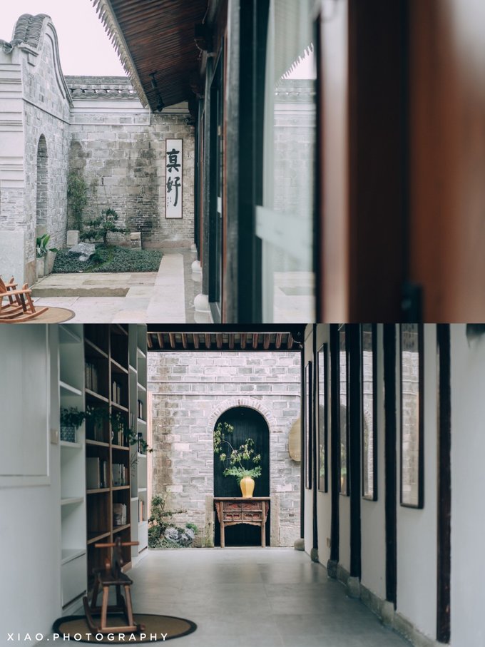 建筑共三进院落,坐在靠近门口的院子里,可以越过三道门,看到最里层的墙壁,每道门的光线和深浅都有差异,层次立即显现出来。