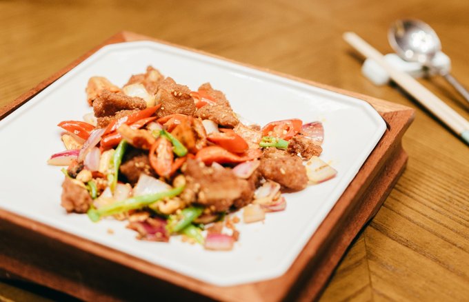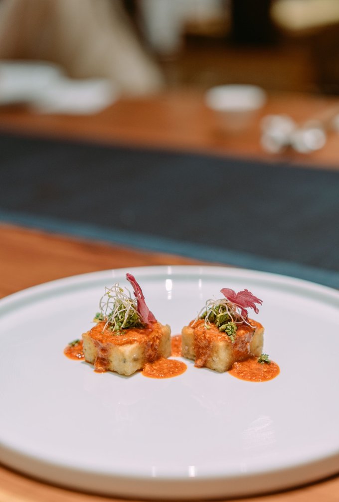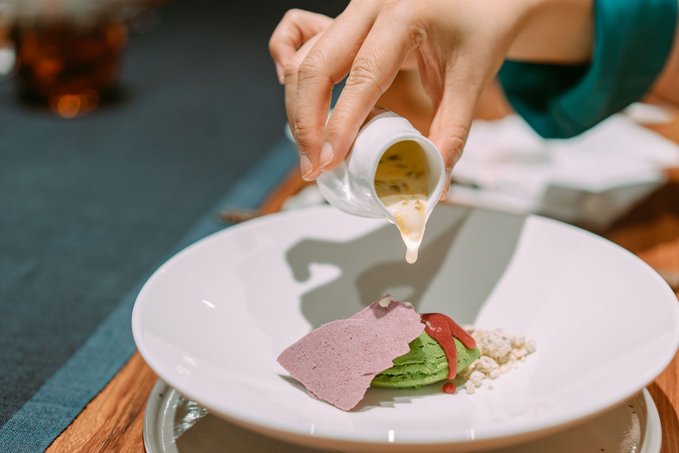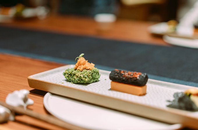以前菜为例: 温烘烤箱烘烤8小时,高油温炸发的炭黑脆片;芳草地酱汁;由芦笋、西蓝花、小番茄,牛肝菌制作的芳草粒;炭黑面包糠;姬松茸吊高汤煮的山药;制作工艺繁琐的绿翠粉、芝麻酱;大红浙醋,东古酸梅酱,梅子酸辣汁,野山椒等腌制的泡菜……