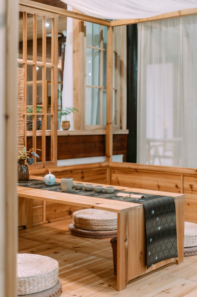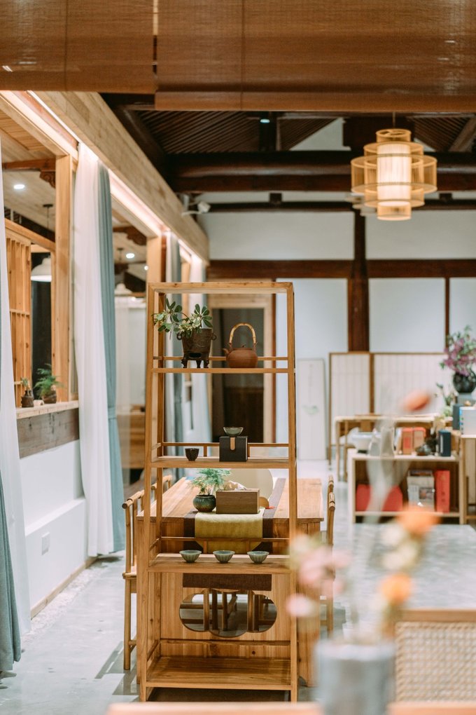 院里还设有茶空间、疗愈养生馆、花艺美学、女性美学、书房、食养房、亲子房……开放式的空间、深棕色的实木元素……在这里,可私享、可小聚、可品茗、可禅静……