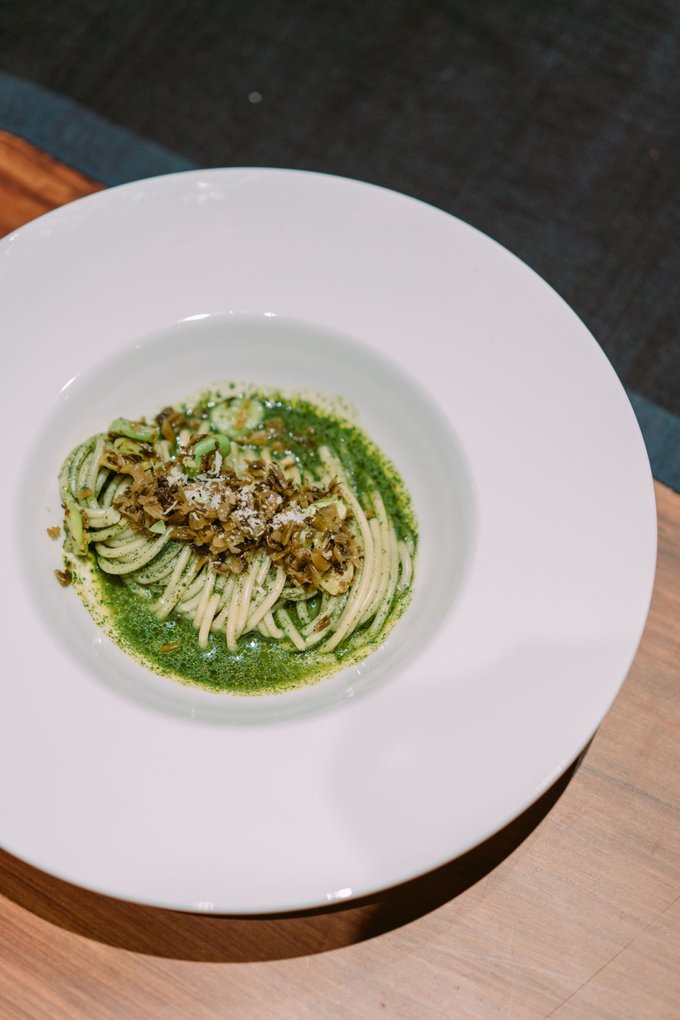 主食: 面条:三文尼面粉,蛋黄4个,全蛋1个,菠菜汁,盐,橄榄油,菠菜汁颜色一定要重,打好包住放冰箱醒一小时再压面; 雪菜豆瓣:雪菜出水,豆瓣出水,炒干后切碎,锅内放少许油,蒜末炒香,雪菜炒香,料酒,少许生抽,蘑菇精,放入豆瓣,香油,冰凉冷却; 青酱:罗勒叶,芝麻叶,橄榄油,松子,一起打碎。面条煮八分熟,青酱放入平底锅,菠菜汁,高汤,牛奶,奶酪,收汁; 高汤:昆布加胡萝卜吊汤……