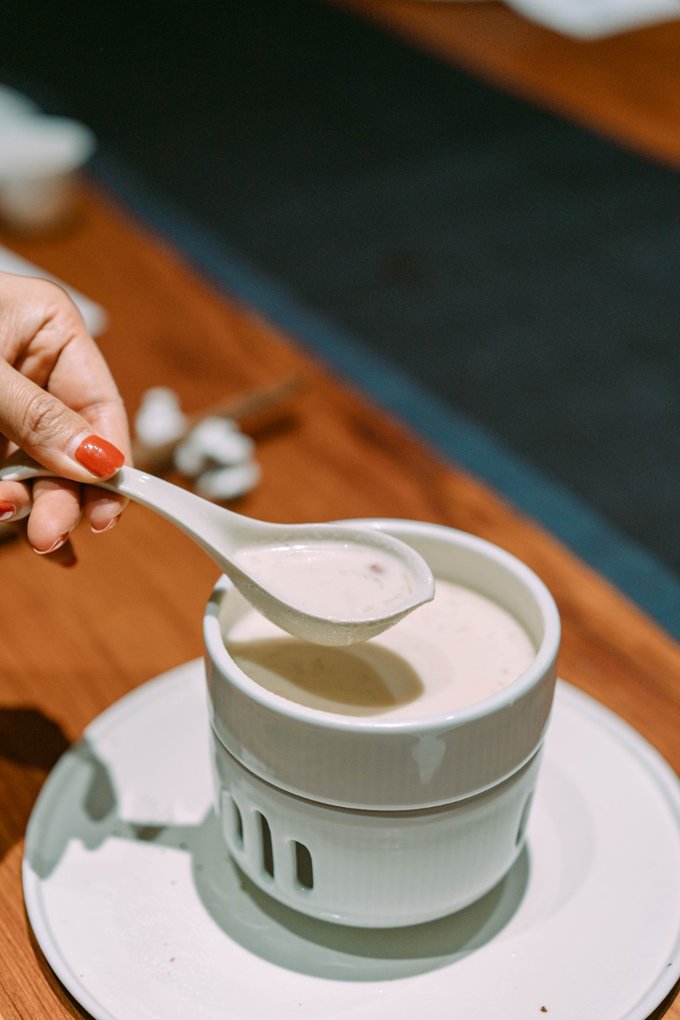 饮品: 银耳加水煮桂圆,煮苹果,洛神花,过滤以后放洋甘菊。橙子泡沫:橙汁或果粒橙,大豆磷脂,打发……