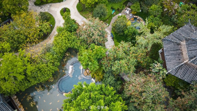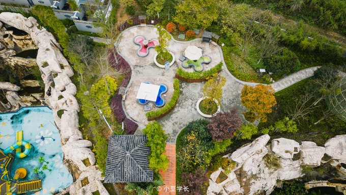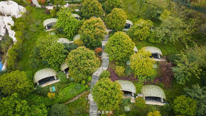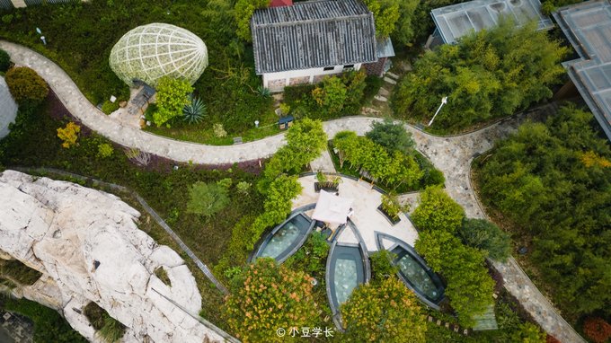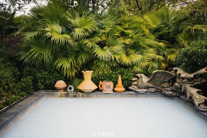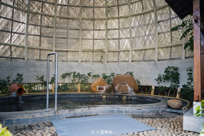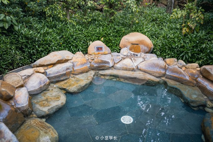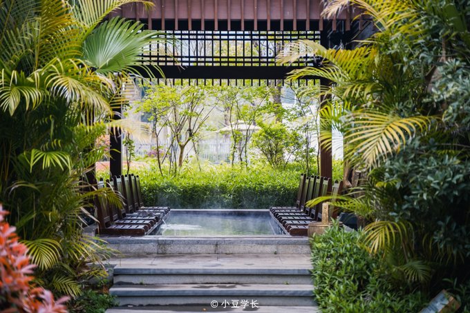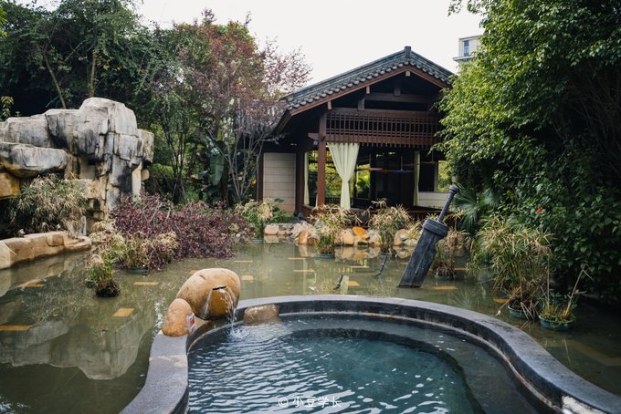初入户外温泉区,宛若走进一座如诗如画的古代庭院。草木相伴,山水相依,徐徐上升的蒸汽缭绕在身旁,好似步入“桃花源”。