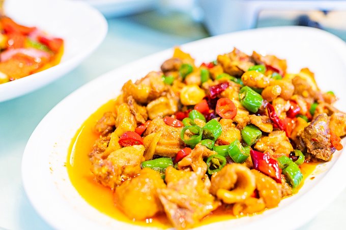 还有一个必吃的是松滋鸡。它不仅是当地特产,也是全国农产品地理标志之一。特别挑选松滋当地散养的土鸡来烹饪,色泽金黄,鲜香可人,肉质鲜美,有韧劲,越嚼越香。