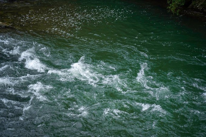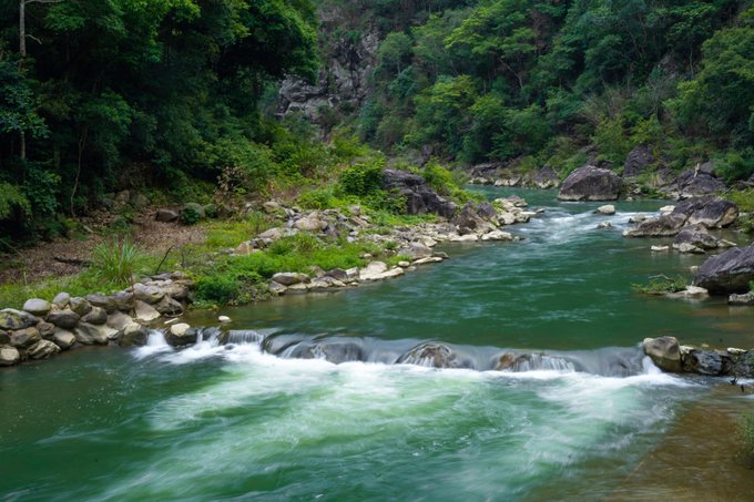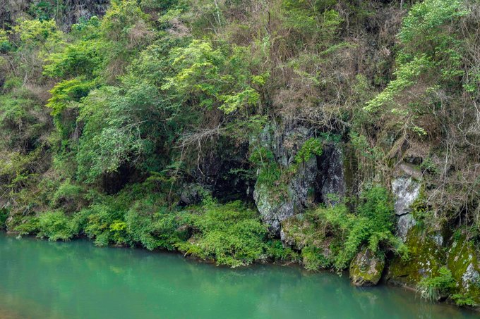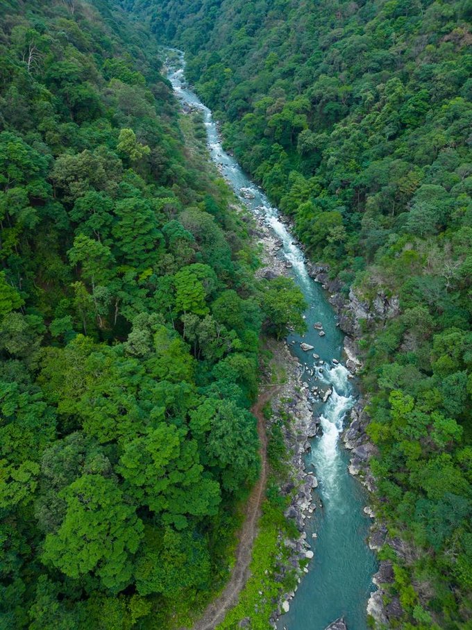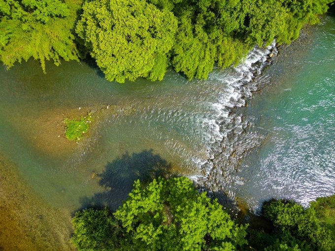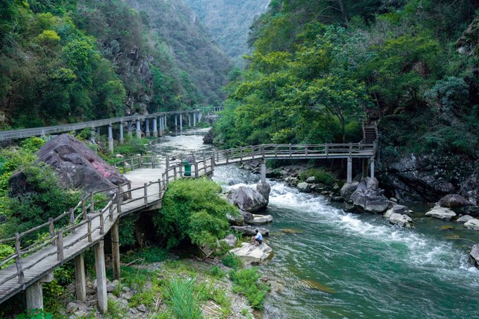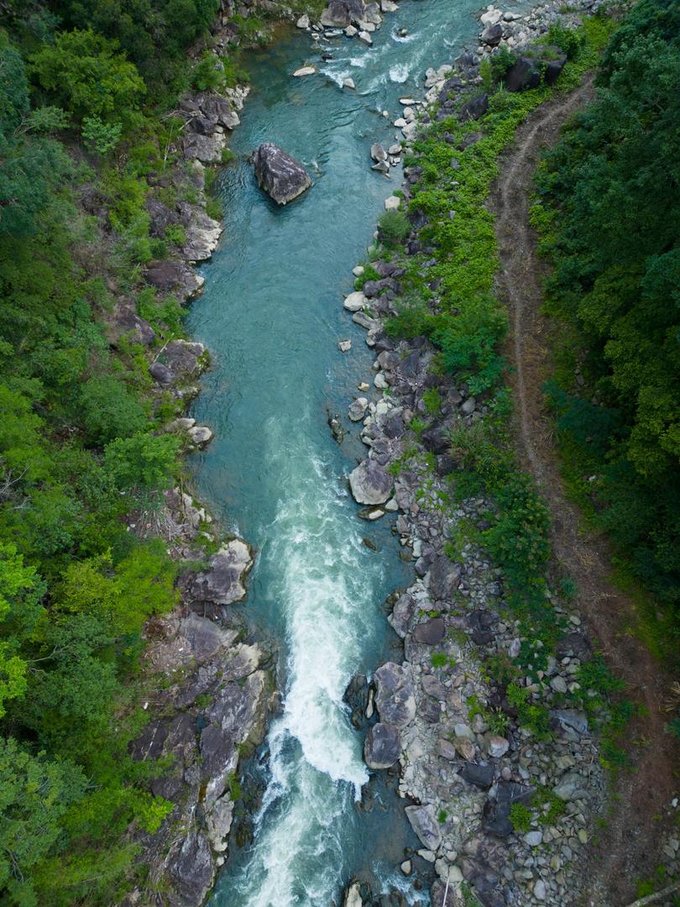 横看成岭侧成峰,我决定要换一个角度欣赏这绝美的虎啸峡,当无人机飞上天空,两岸绿树成荫,谷中巨石成群,形态各异,千奇百怪,峡谷幽深曲折,蜿蜒流长,构成一幅美丽的峡谷风景图。