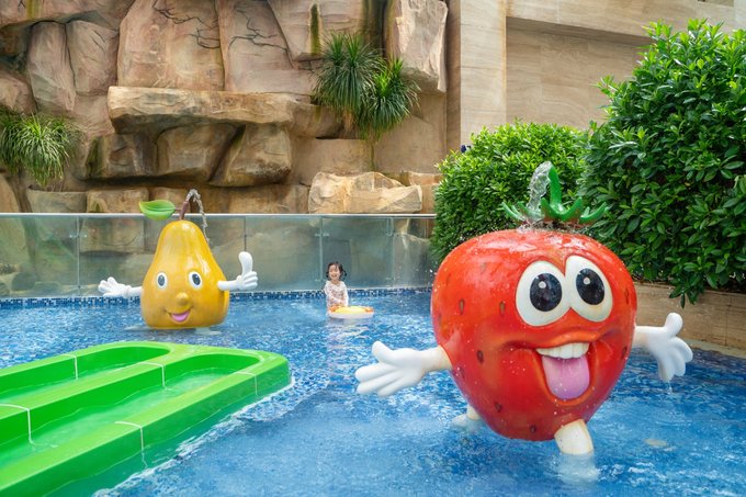 水上滑梯、攀爬架等,还有童趣可爱的水果玩偶造型,小米粒在这里玩的不想走。