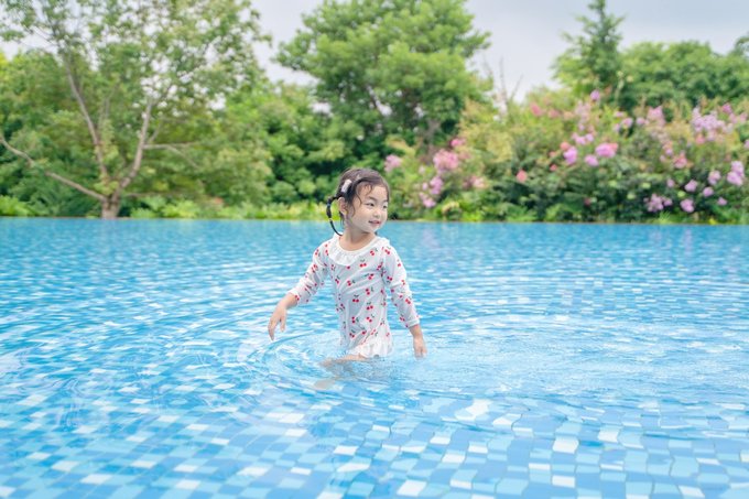 小家伙说了好久要游泳,这下可以尽情玩啦。 深水区需要带泳帽,带孩子在浅水池玩,家长在旁边看着就好。